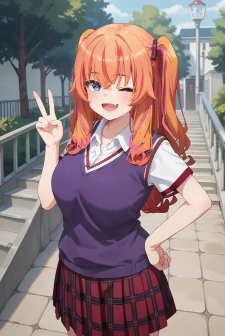 outfit_1, 학교 유니폼, 스웨터 베스트, 보라색 베스트, V넥, 흰색 셔츠, 칼라 셔츠, 윙 칼라, 짧은 소매, 빨간 치마, 체크무늬 치마, 보라색 양말, 큰 가슴,