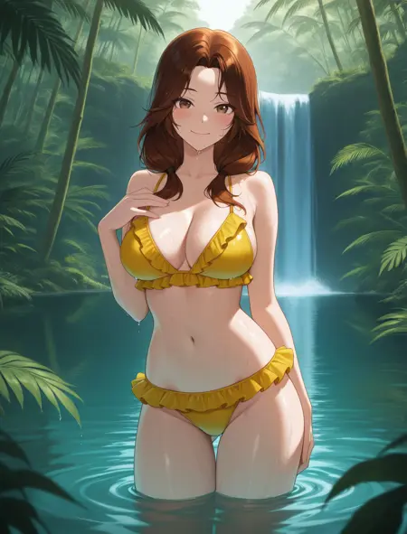 黄色のシャツ、鎖骨、長袖、長い茶色のスカート