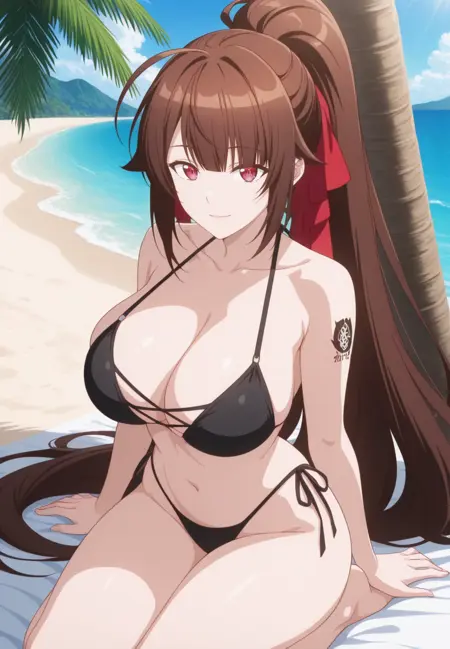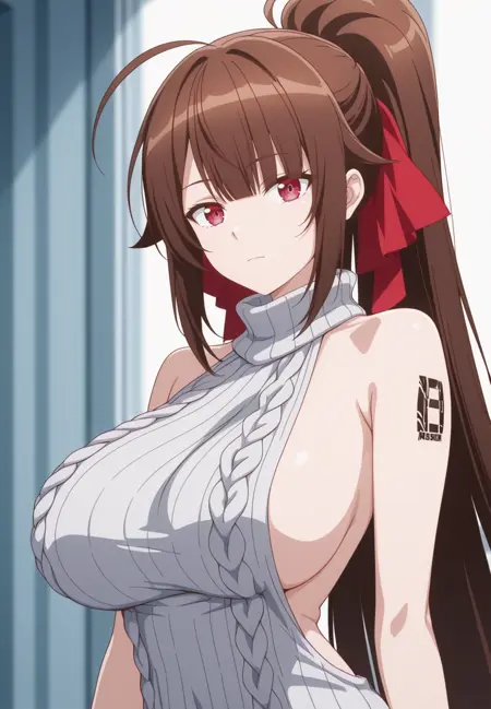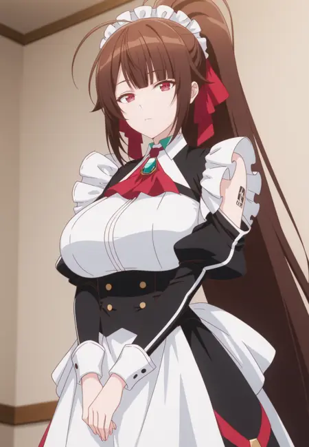 /amagi/, 1girl, 非常长的头发, 棕色头发, 红眼睛, 马尾, 天线辫