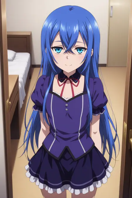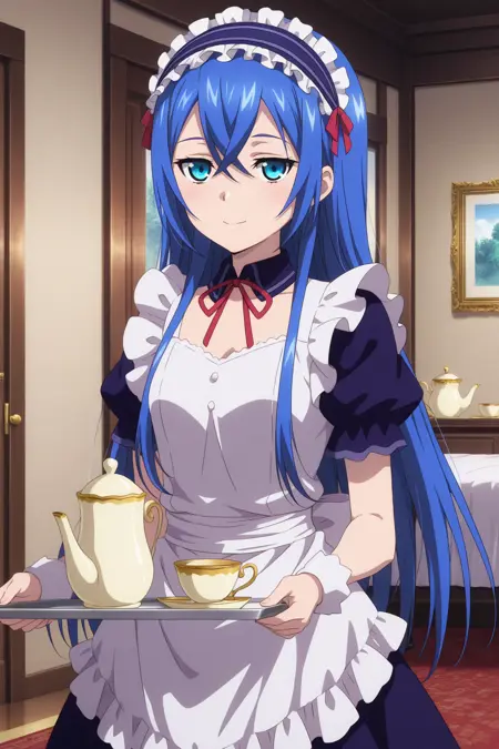 aaastarte, blue eyes, blue hair, crossed bangs, blue hairband, maid headdress, detached collar, red neck ribbon, black dress, maid apron, white apron, short sleeves, wrist cuffs, frills, anime coloring,