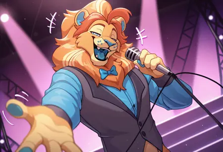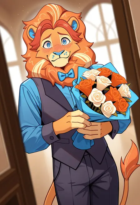 Illustrious SFW: best quality, amazing quality, very aesthetic, absurdres, newest, lloydford_lion, furry, furry male, 1boy, solo, vest, bowtie, ...your tags...