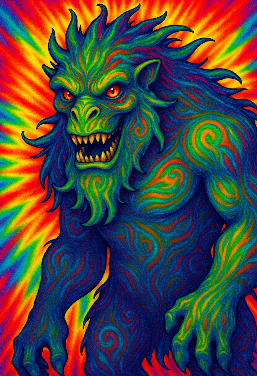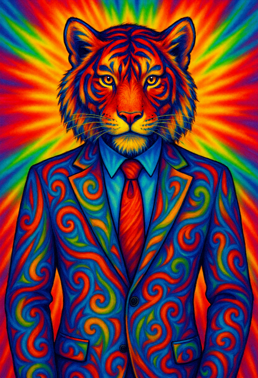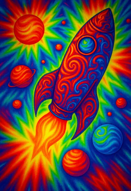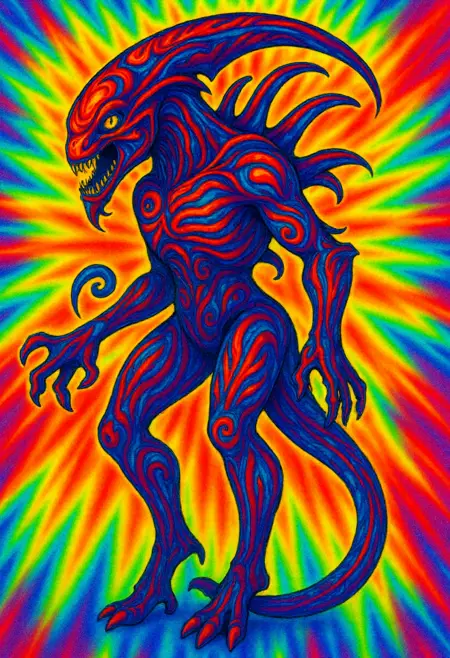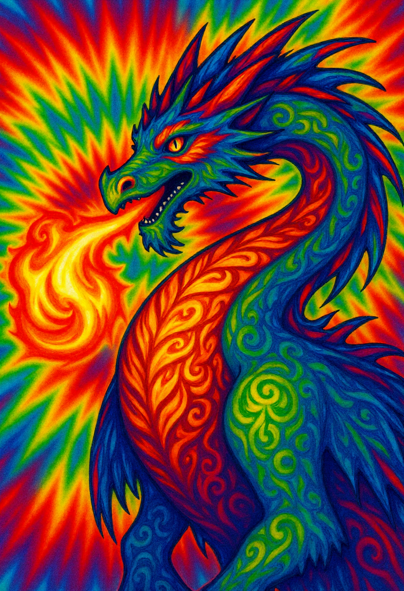 프롬프트: 이는 **(SUBJECT)**를 타이다이 아트워크를 연상시키는 휘몰아치는 패턴으로 렌더링한 화려하고 환상적인 디지털 드로잉입니다.