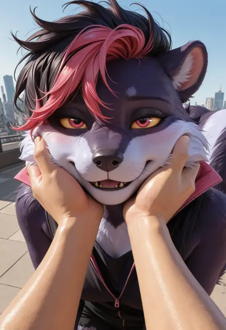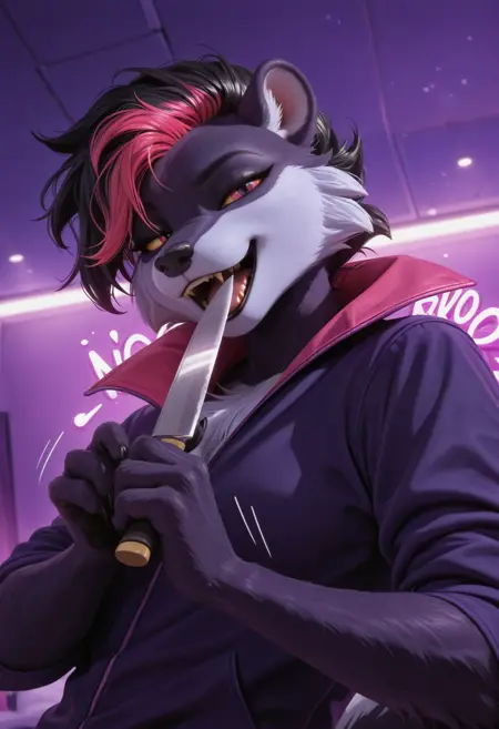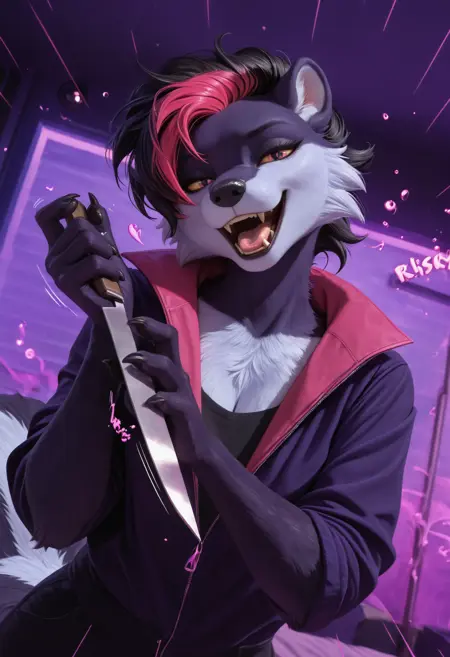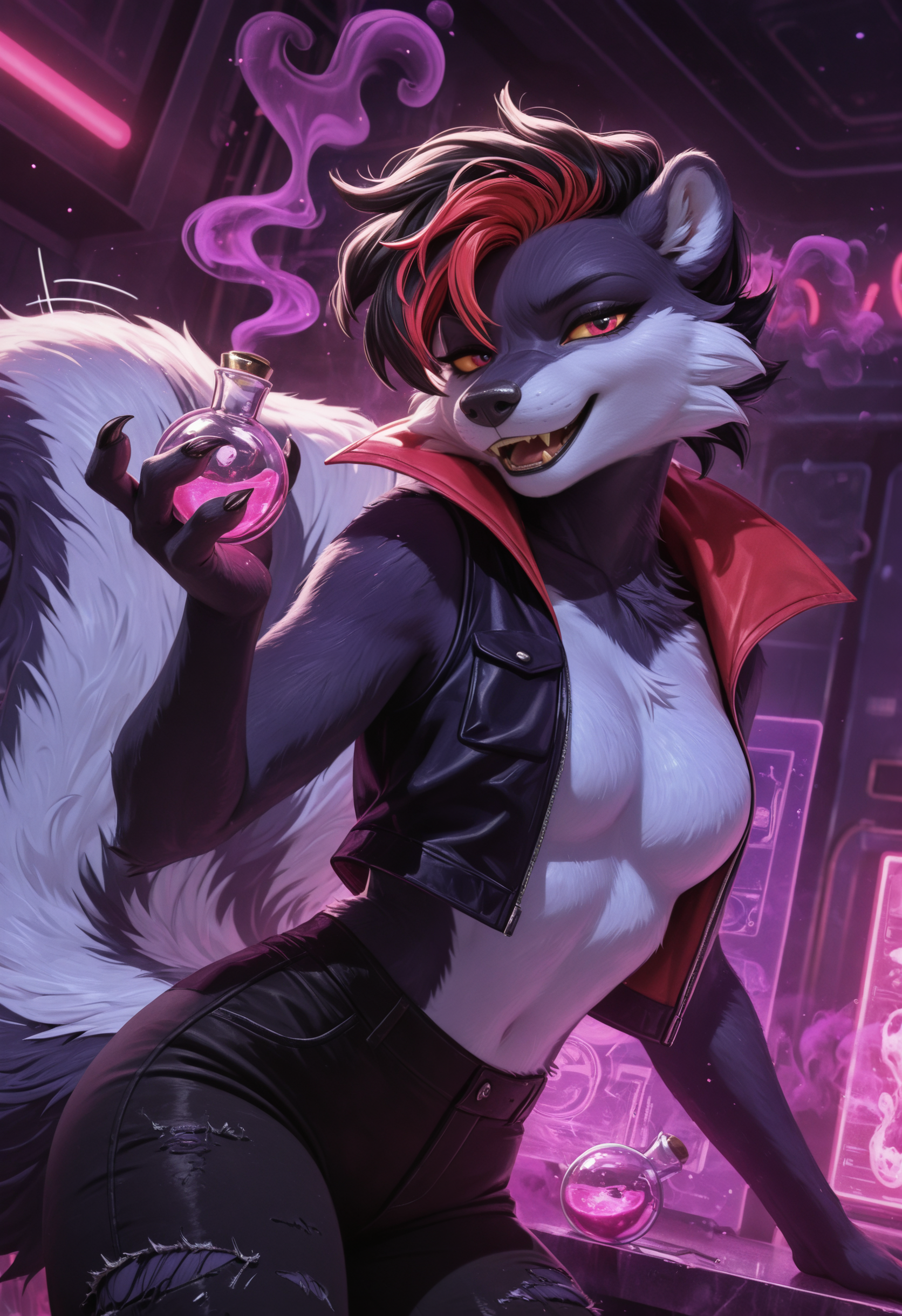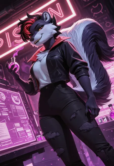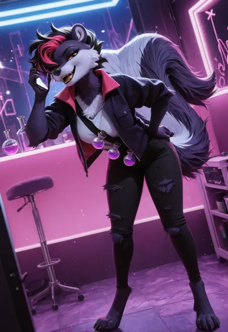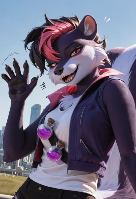 a1em_the_2kunk, skunk, furry, solo, multicolored hair, animal ears, tail, black hair, colored sclera, yellow sclera, body fur, furry female, claws, clothes, clothed, looking at viewer, 1girl, flask, torn pants