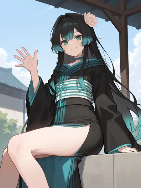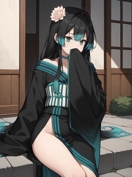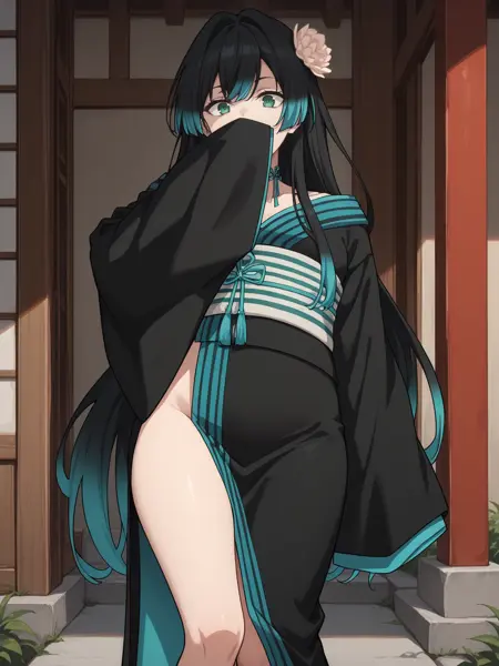 服饰:黑色和服,白色腰带,条纹腰带,蓝色项圈,长袖,宽袖,侧开衩,赤腿