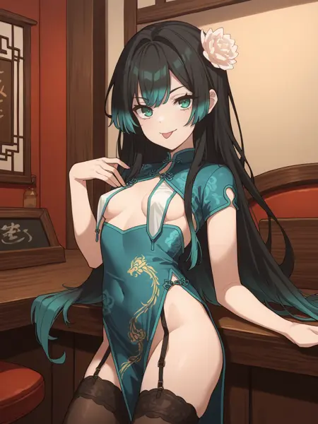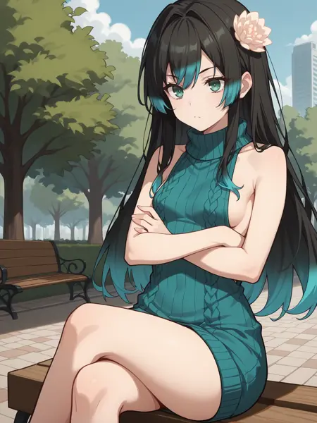 外观:ilcarm,长发,黑发,彩色头发,绿眼,发饰花朵,小胸