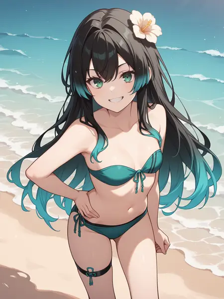 Apperance: ilcarm, long hair, black hair, multicolored hair, green eyes, hair flower, small breasts
