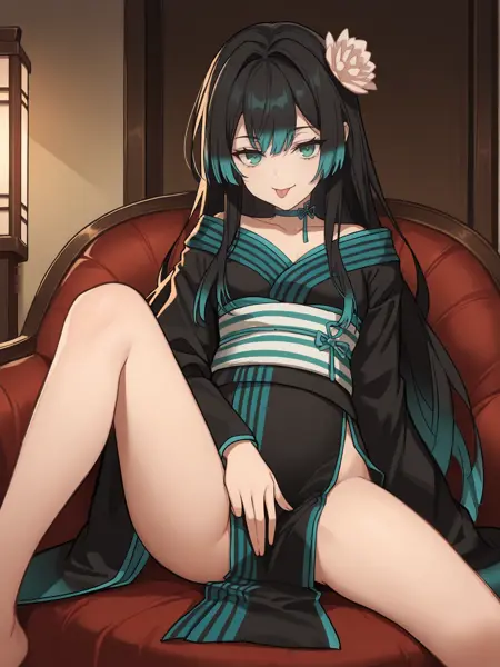 Outfit: black kimono, white sash, striped sash, blue choker, long sleeves, wide sleeves, side slit, bare legs
