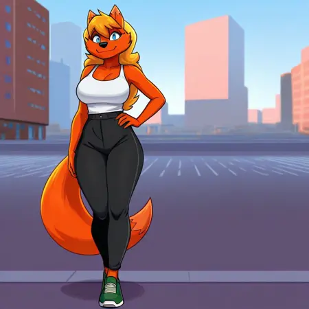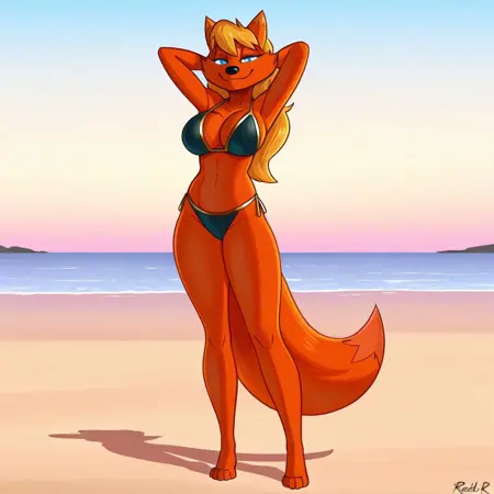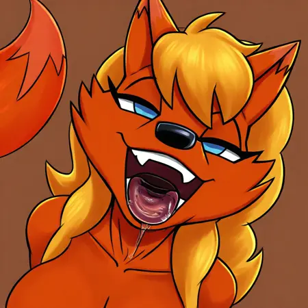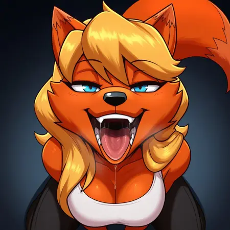 fox girl, redish-orange fur, blonde hair, long hair, blue eyes, black nose, fox tail, large breasts,