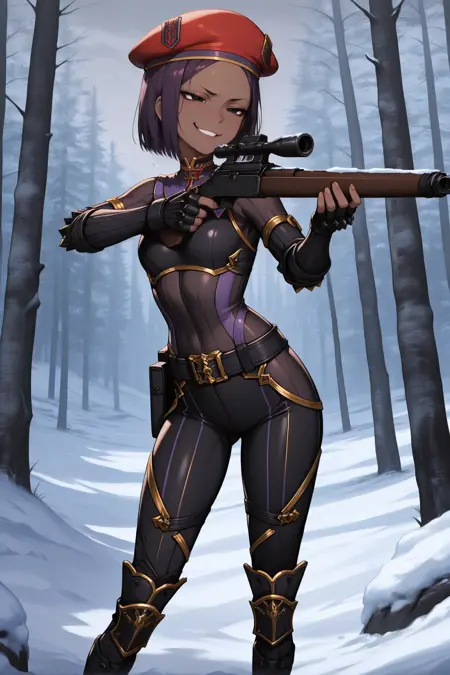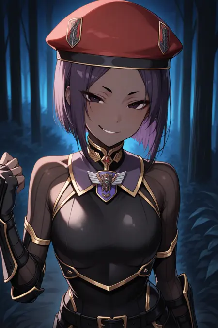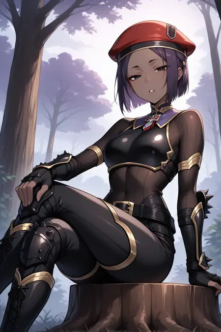 그녀의 전형적인 외모를 표현하려면 "빨간 베레모, 검은 바디수트, 갑옷, 검은 장갑, 손가락 없는 장갑, 벨트, 검은 바지"를 추가하세요.