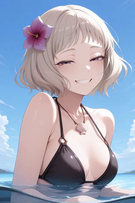 Trigger word is "nklgf" and "platinum blonde hair, short hair, purple eyes" is required.