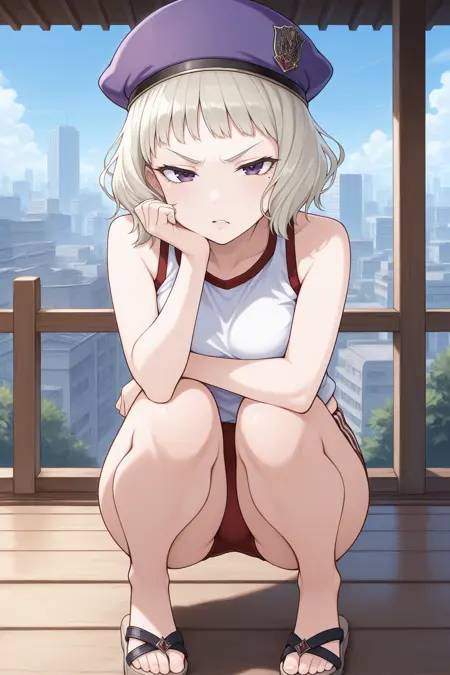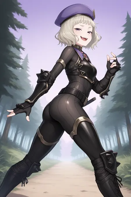 Add "purple beret, purple collar, black bodysuit, black armor, fingerless gloves, black gloves, black belt, black boots" for her typical look.