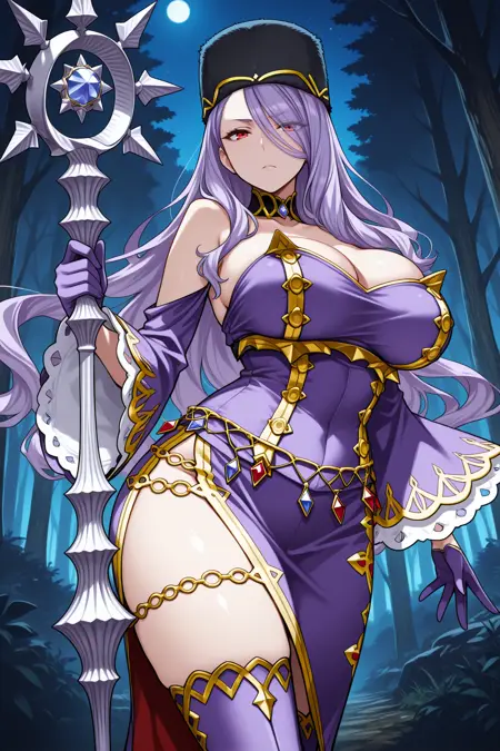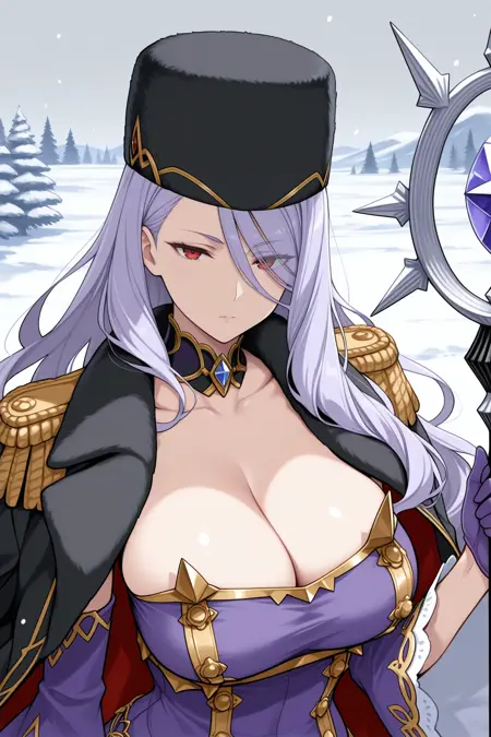 그녀의 전형적인 외모를 위해 "검정색 머리장식, 모피 모자, 분리된 칼라, 검정 칼라, 어깨에 떨어진 검정 코트, 어깨장식, 보라색 드레스, 금장식, 흉부 노출, 측면 슬릿, 분리된 소매, 넓은 소매, 보라색 소매, 보라색 장갑, 허벅지 부츠, 보라색 부츠"를 추가하세요.