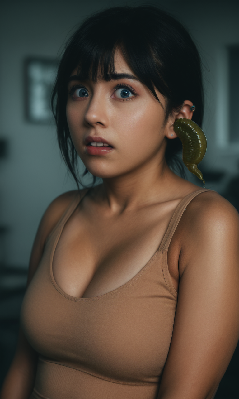 这个LoRa将帮助你生成一幅逼真的图像,描绘一名女性耳朵中伸出一只蛞蝓寄生虫。你可能需要调整提示词和LoRa权重,以获得理想效果。