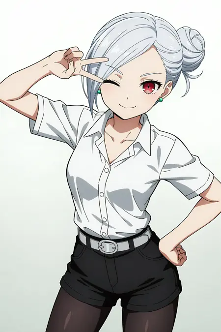 外見: 1girl, solo, 銀髪, 単一の髪の結び目, 髪の結び目, ピアス, ジュエリー, 赤い目