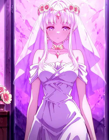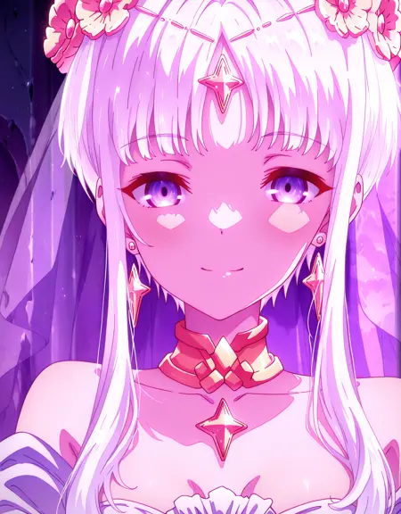 white dress, veil, flower wreath, choker, star hair ornament, earrings, star earrings, jewelry, hair flower