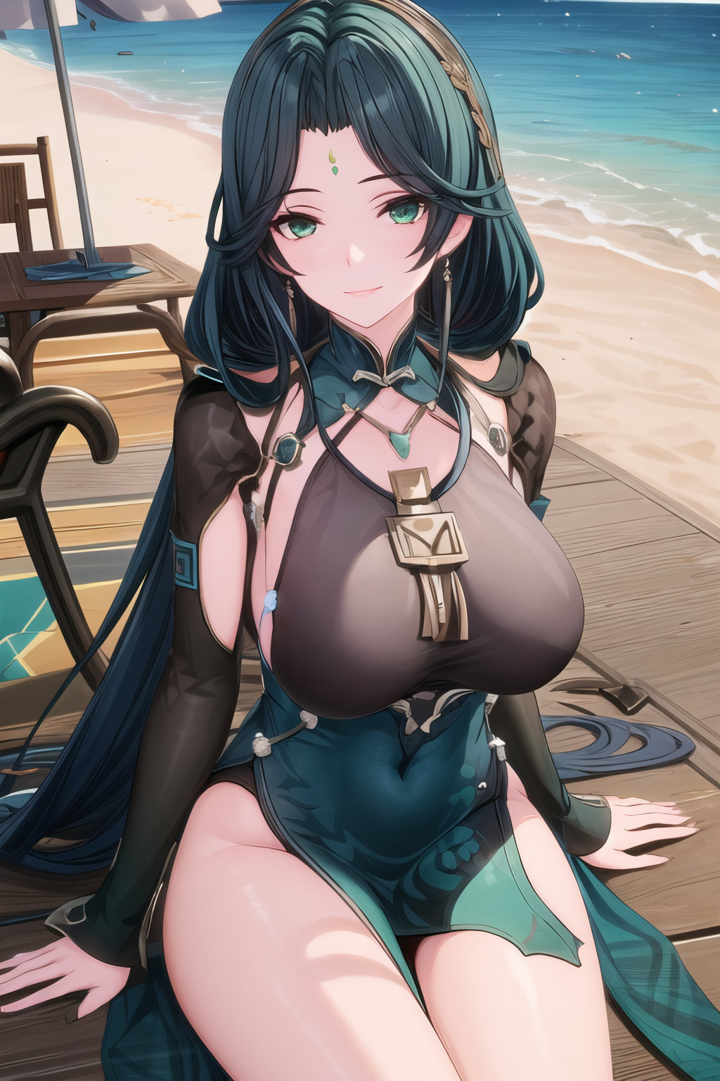 相关特征词:forehead mark,green chinese clothes,very long hair,parted bangs,green thighhighs,single thighhigh,earrings,hair ornament,green capelet,green eyes(可以不写)