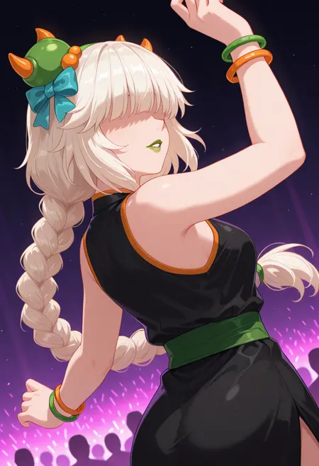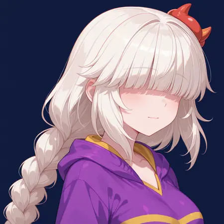 sk-ascorpyra, 1girl, long single braid, blunt_bangs, (hair over eyes), hair_ornament, solo,