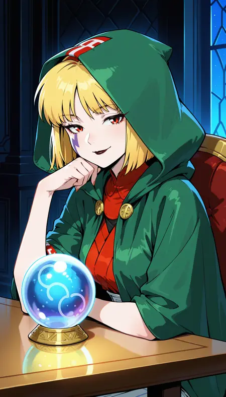 占い師用衣装:緑のマント、緑のフード、赤い縁取り、水晶球