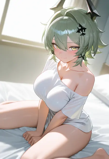 • 她的外貌标签: 1girl, solo, 头饰, 发丝遮眼, 大乳房, 极长发, 绿发, 发丝垂落, 黄色眼睛,