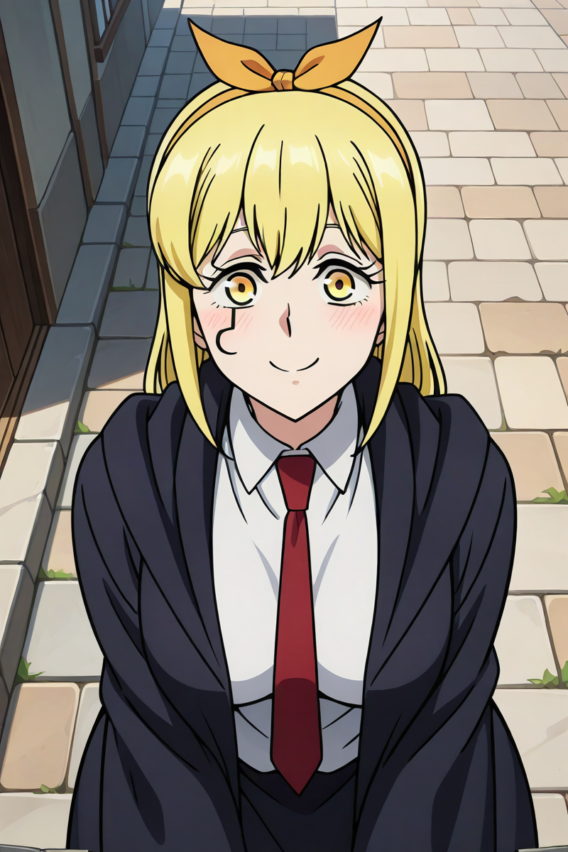 | Trained Words | Lemon Irvine, blonde hair, yellow eyes, hair between eyes, medium hairCopied! orange hairband, orange bow, hair bow, bow hairbandCopied! black robe, open robe, white shirt, red necktie, collared shirt, long sleevesCopied! black skirt, long skirt, black pantyhoseCopied! |