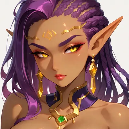 yellow_eyes,purple_hair,dreadlocks,dark-skinned_female,pointy_ears,earrings,(gold_forehead_jewel),forehead_mark,