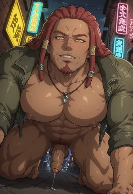 red hair, stubble, goatee, hair tubes, dreadlocks, Dark skin,