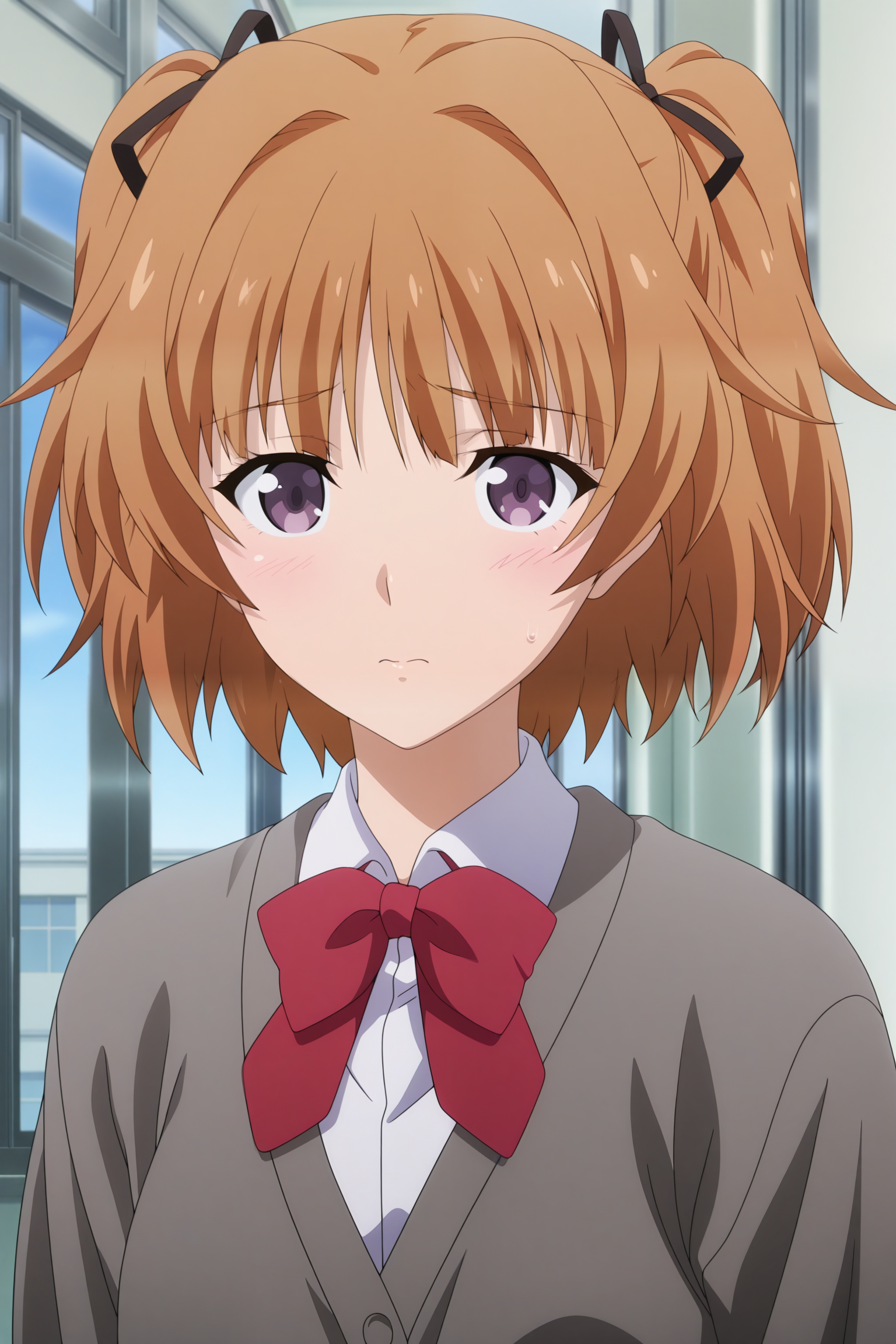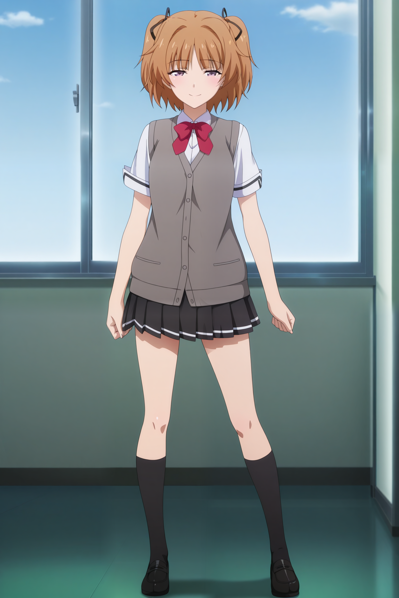 yuuki uguisu, 단발, 갈색 머리, 양쪽 올린 머리, 검은 머리 리본, 머리 끝, 희미한 앞머리, 자주색 눈, 짧은 소매, 흰 셔츠, 칼라 셔츠, 회색 스웨터 조끼, 빨간 리본 넥타이, 검은 치마, 주름 치마, 검은 양말, 무릎 높이 양말, 검은 신발, 로퍼