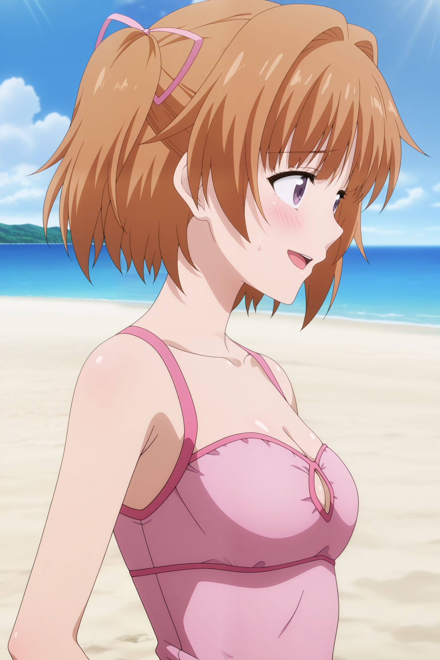yuuki uguisu, 단발, 갈색 머리, 양쪽 올린 머리, 분홍 머리 리본, 머리 끝, 희미한 앞머리, 자주색 눈, 수영복, 드레스 수영복, 분홍 수영복, 프릴이 있는 원피스 수영복, 가슴 절개 디자인