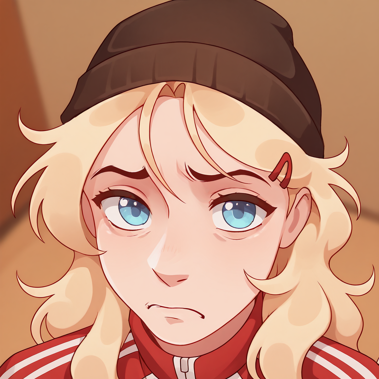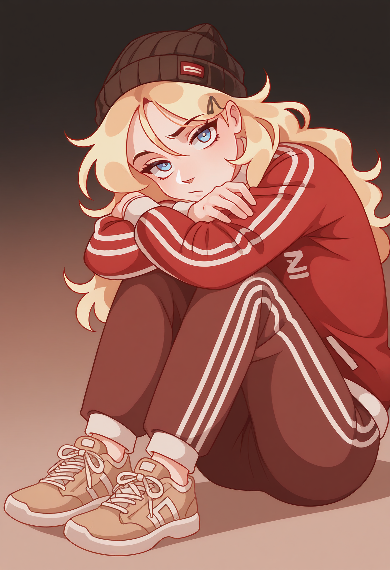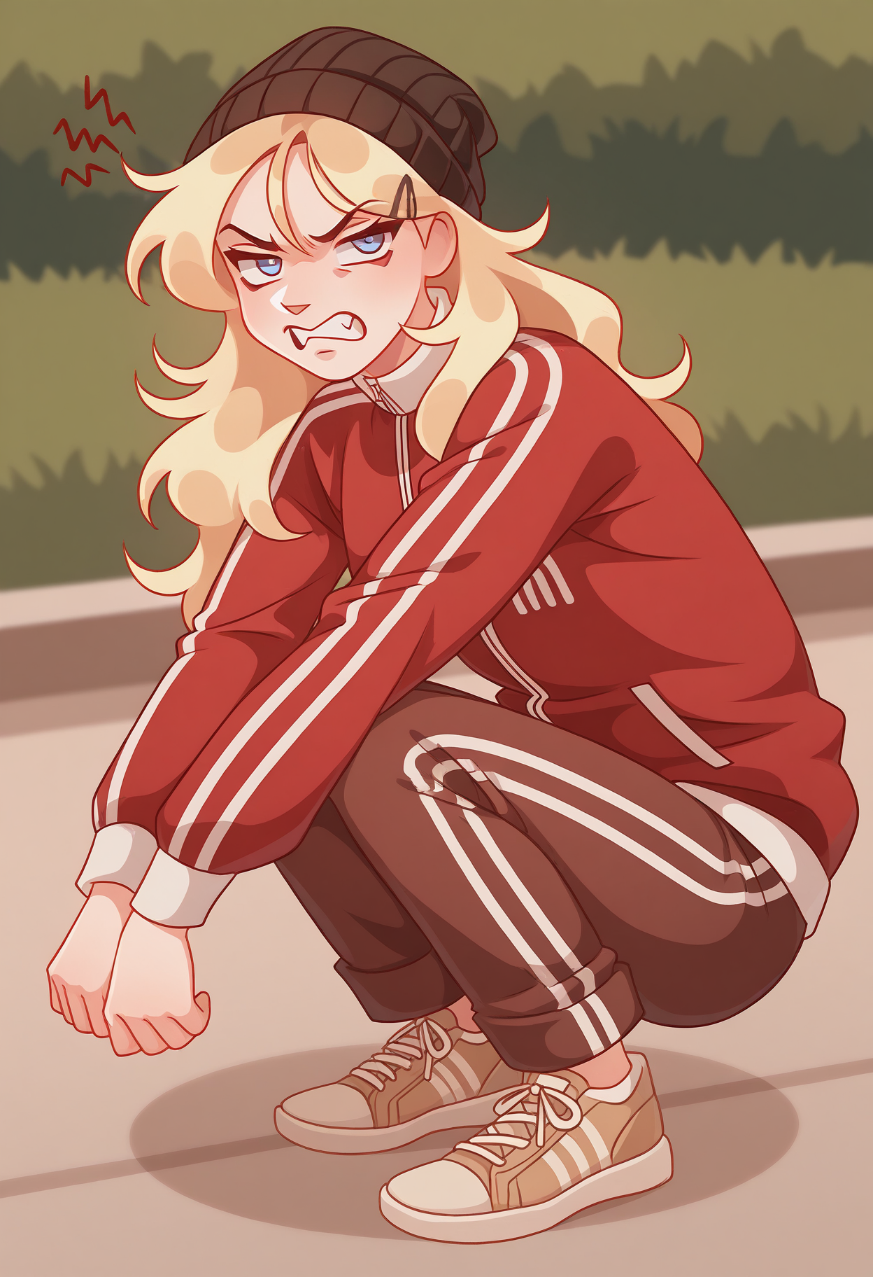 프롬프트: Zhenya-vkstickrs, 빨강과 흰색 줄무늬 트랙수트, 어두운 빽지, 긴 파마한 금발 머리, 파란 눈, 갈색 스웨트팬츠, 갈색 스니커즈