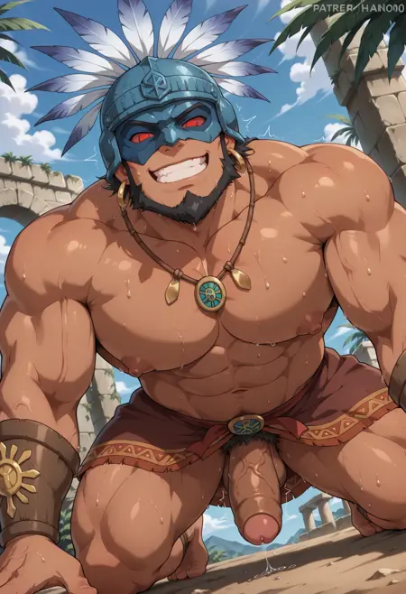 | 训练词汇 | black hair, red sclera, no pupils, long sideburns, chinstrap beard, jawline beard, Maya helmet, blue helmet, plumed headdresses, feathers, half mask, blue mask, hoop earrings,已复制! Maya necklace, upper arm armor, brown arm armor, Maya wraparound skirt,已复制! |