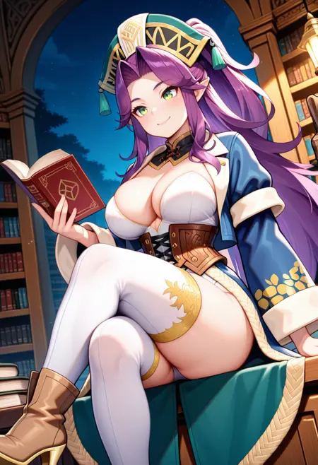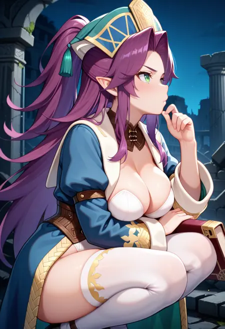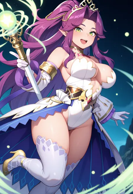 1girl, solo, seikenLight, 紫色头发, 长发, 发丝飘动, 高马尾, 绿色眼睛, 尖耳朵, 大胸部,