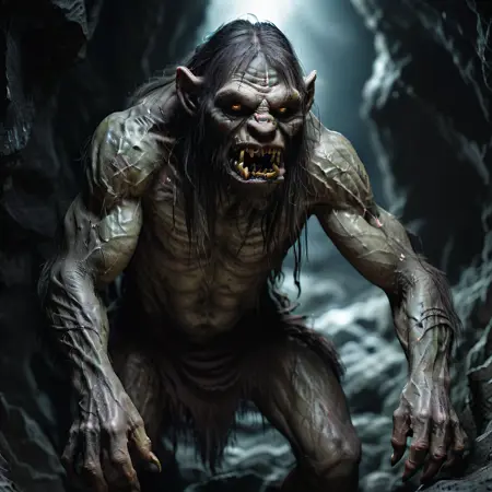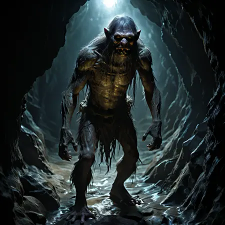 bald, beard, black hair, claws, clenched teeth, facial hair, fangs, full body, glowing, glowing eyes, loincloth, long hair, looking at viewer, male focus, muscular, old, open mouth, pointy ears, red eyes, rpgtroll, sharp teeth, standing, teeth, yellow eyes,