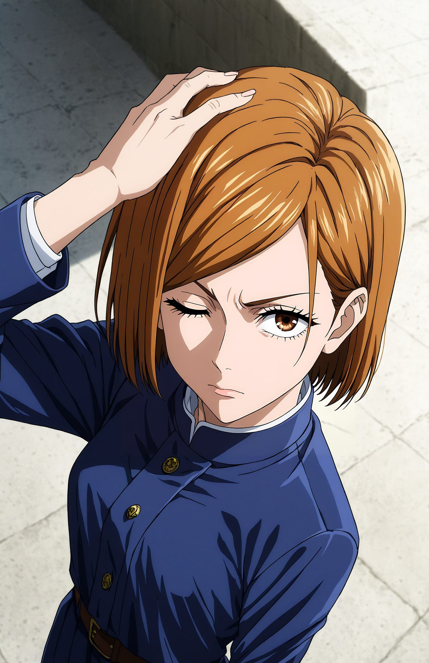 提示词:1girl, solo, kugisaki nobara, brown hair, brown eyes, black jacket, skirt, pantyhose,