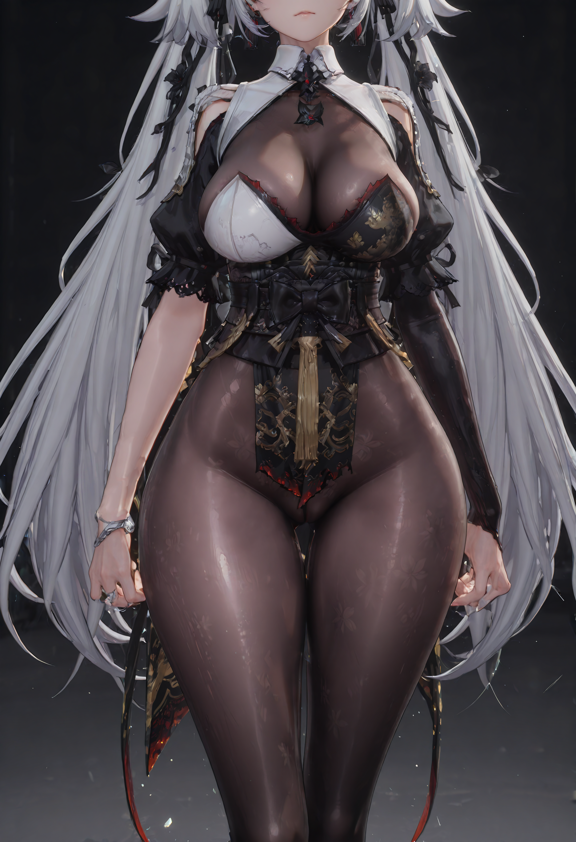 whiterabbit, red eyes, white pupils, white hair, black streaked hair, streaked hair, long twintails, hair ribbon, black ribbon, long ribbon, gradient ribbon, hair flower, black flower, detached collar, short sleeves, print black bodystocking, pelvic curtain, aiguillette, cleavage, red flower on chest, stiletto heels