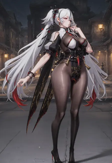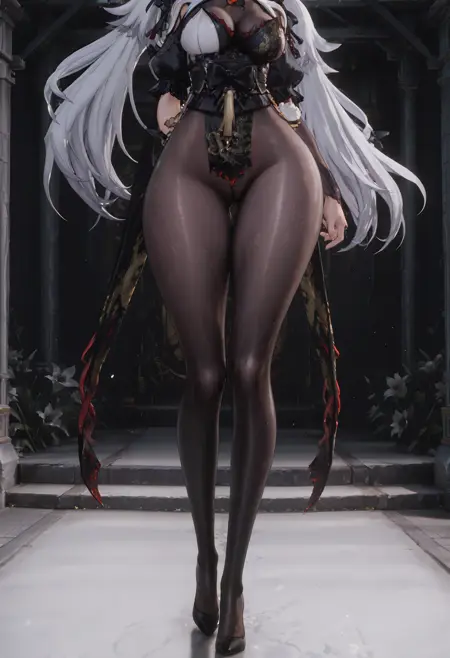 Default, black eyes, red pupils, white hair, black streaked hair, short twintails, hair ribbon, black ribbon, long ribbon, gradient ribbon, hair flower, black flower, gold earrings, detached collar, white collar, white shrug\(clothing\), short sleeves, collarbone, red flower on chest, white dress, sideless dress, navel cutout, ballet dress, single arm guard, white shorts, uneven legwear, single leg pantyhose, white pantyhose, white leg garter, toeless footwear, white footwear