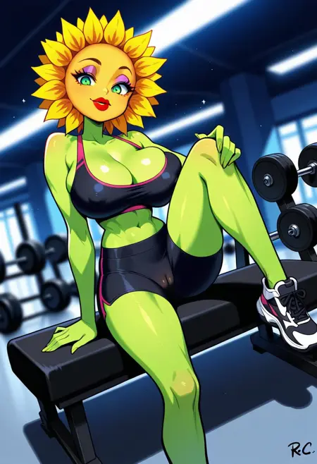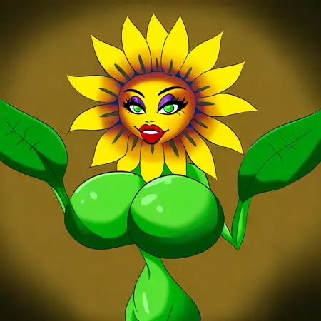 SunflowerCLR, 1girl, solo, flora fauna, flower humanoid, plant humanoid, plant girl, green skin, colored skin, round yellow head, sunflower head, green eyes, eyeshadow, large lips, red lipstick, eyelashes, makeup, leaf hands, large breast, skinny waist, round breast,
