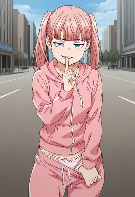 1girl, bando_ram, ピンクの髪, まっすぐな前髪, ツインテール, 青い目, 舌にピアス