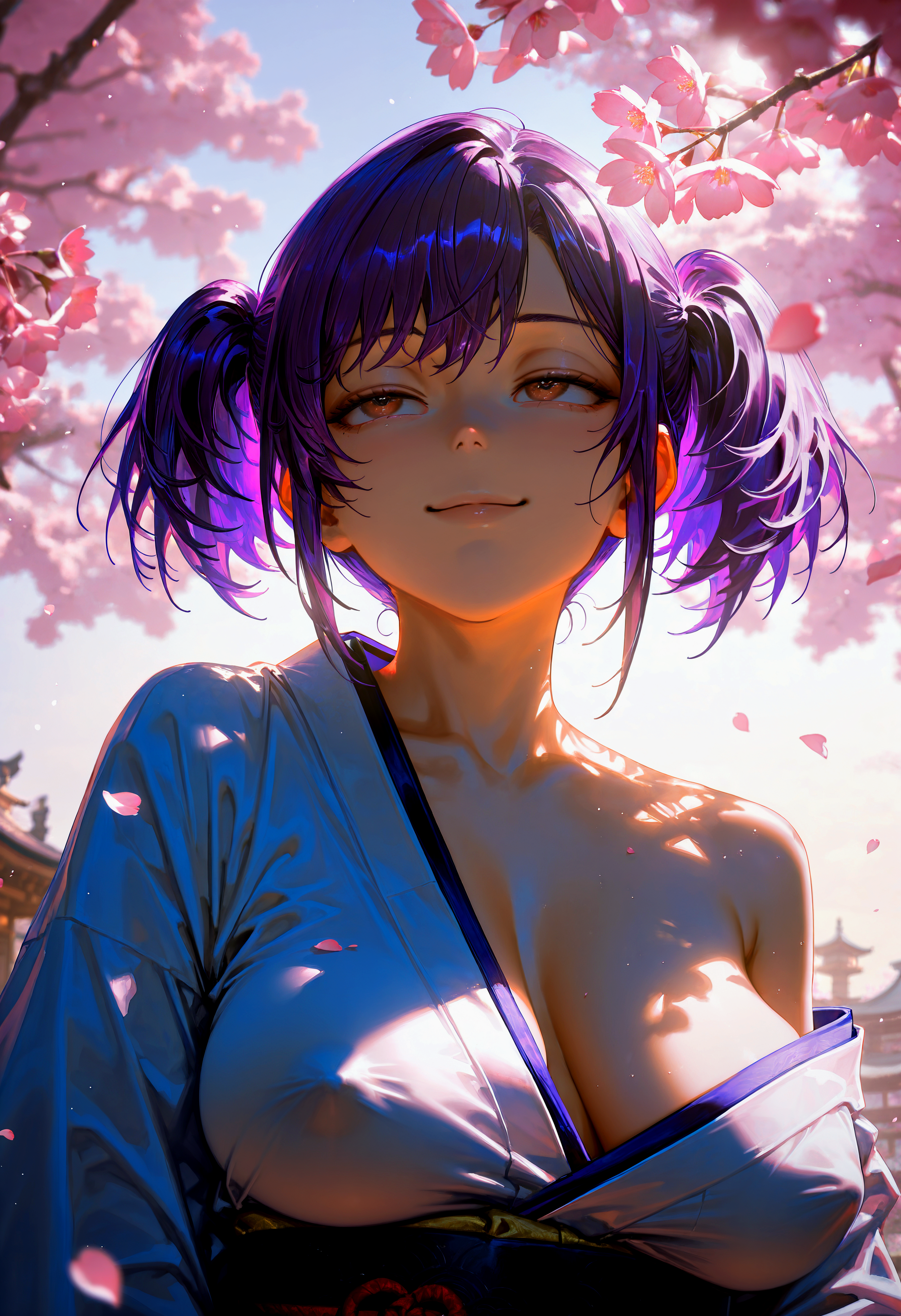 1girl, brown eyes, purple hair, short twintails, spikey hair, wispy bangs, huge breasts, wide hips, (thick thighs:1.15),