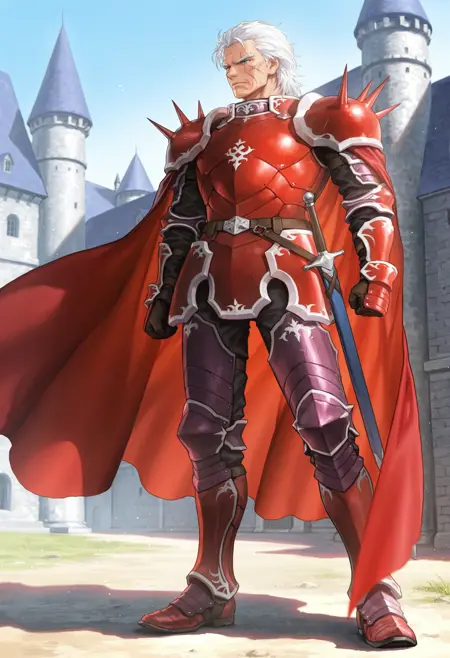 触发词:jagen_(fe), 1boy, 白发, 蓝眼, 老人, 红色盔甲, 斗篷, 尖刺