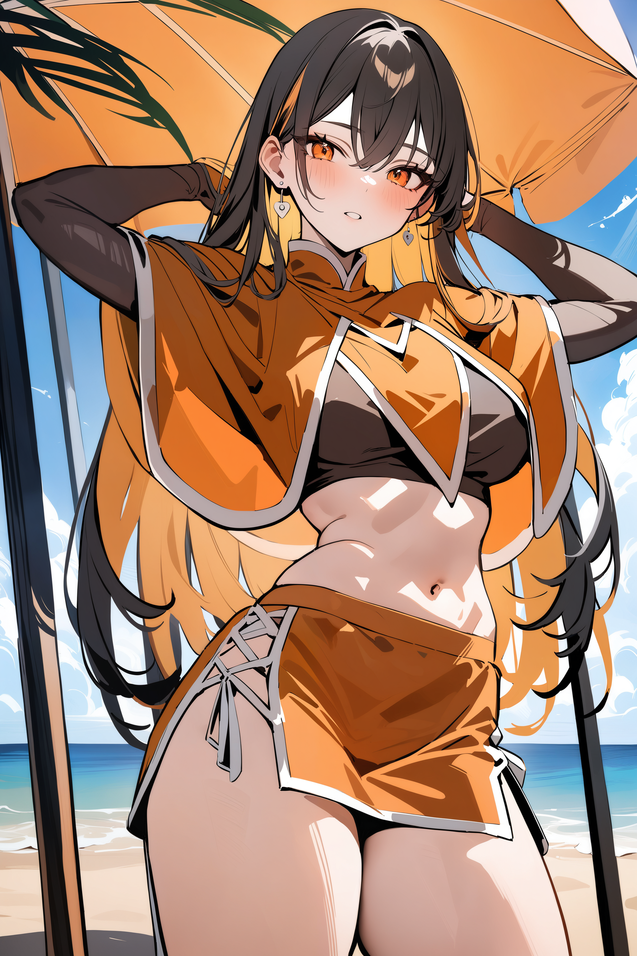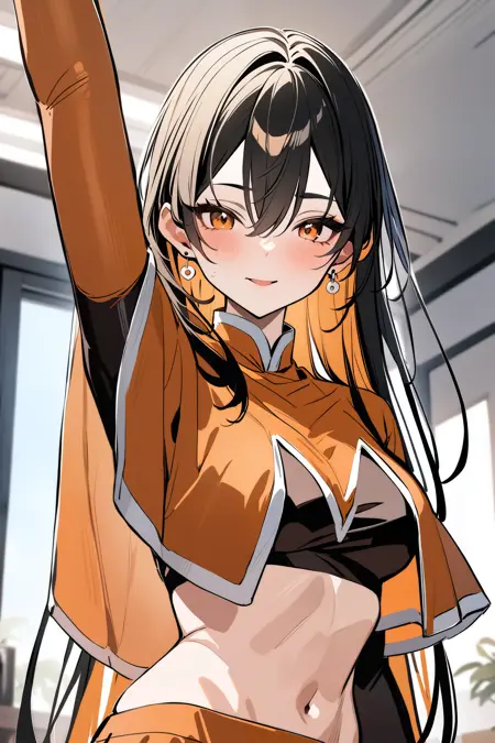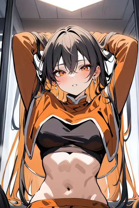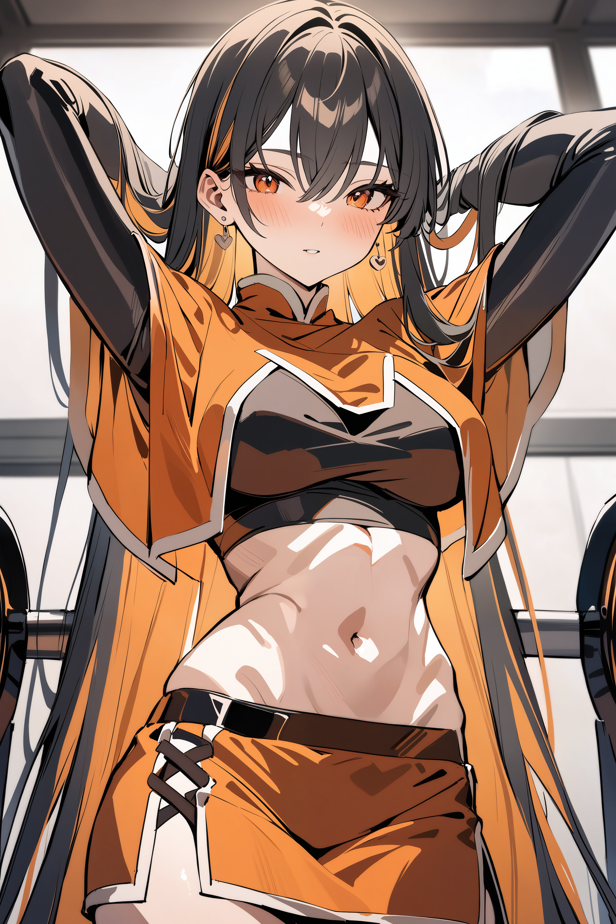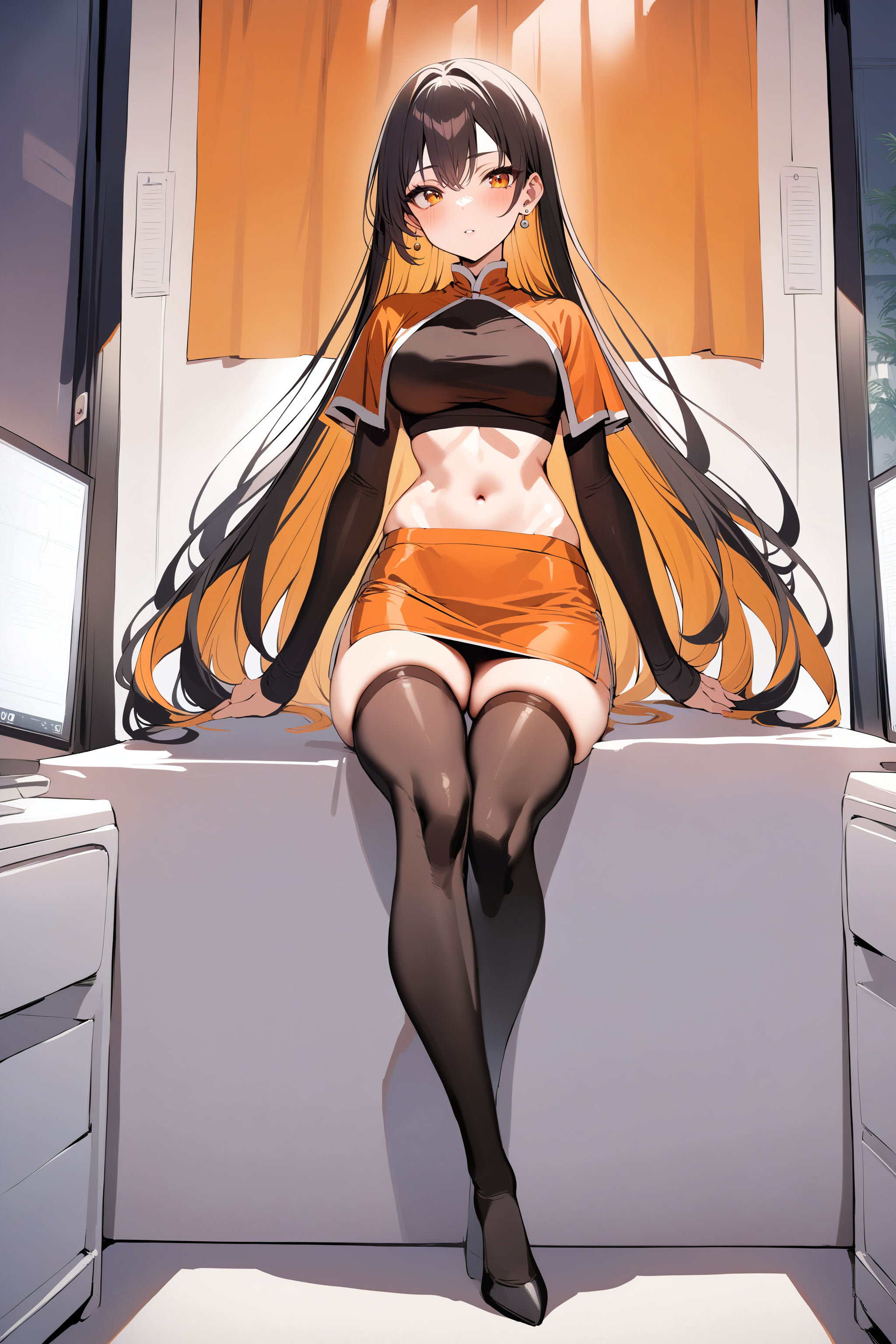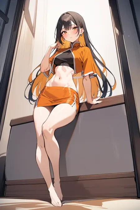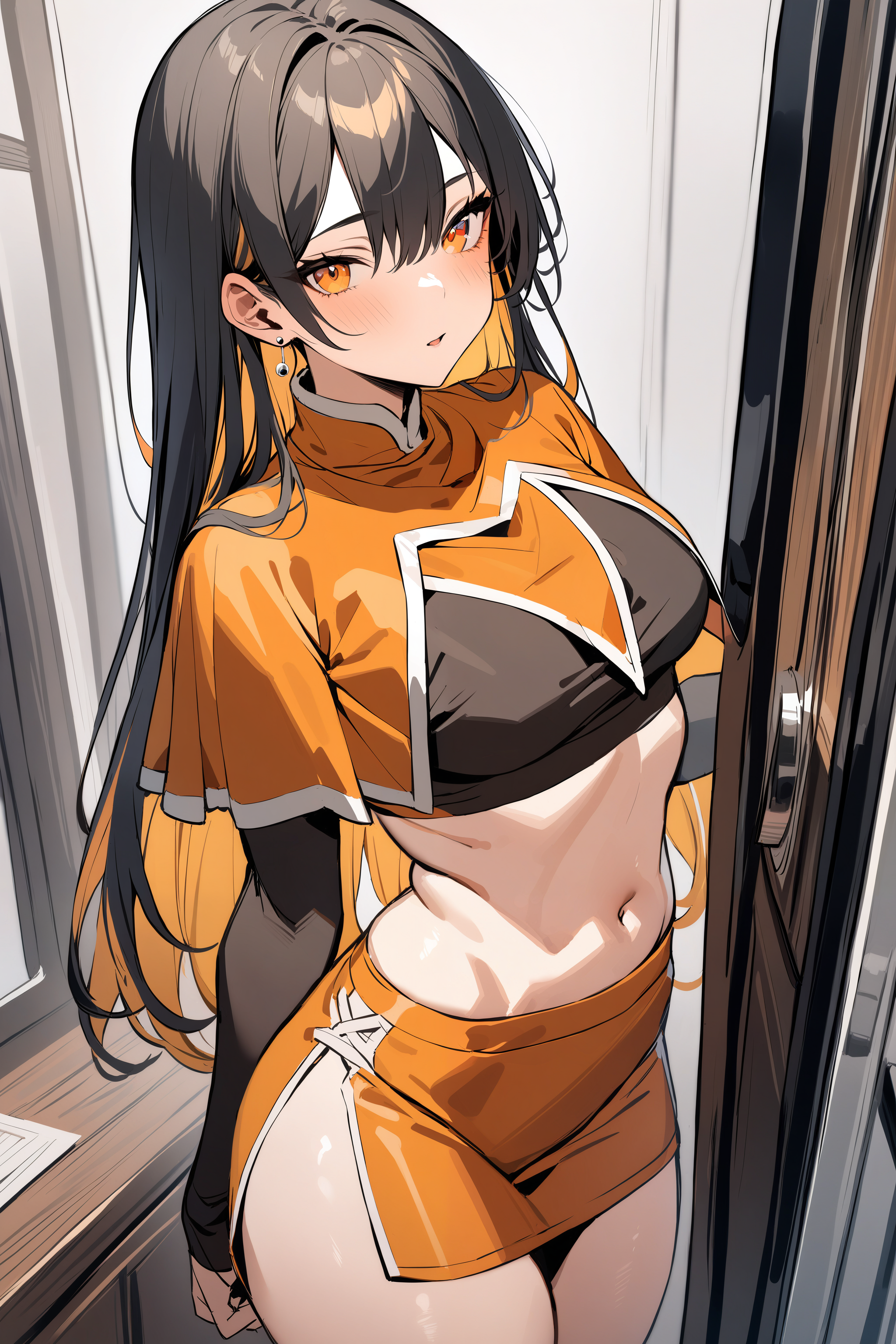 monerochan,黑发,内层发色为彩色,橙色短裙,橙色小披肩,深色露脐上衣,袖子,肚脐,腰部,橙色眼睛,圆形耳钉,