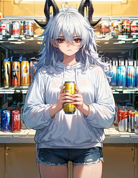 score_9, score_8_up, score_7_up, source_anime, high contrast, masterpiece, best quality, amazing quality, very aesthetic, high resolution, ultra-detailed, white_sweatshirt, daisy dukes, (holding energy can:1.3), (cowboy shot:1.5), Zani, white_hair, medium_long_hair, messy hair, straight_hair, black_horns, red_eyes, sharp_eyes, long_eyelashes, serious expression, shop