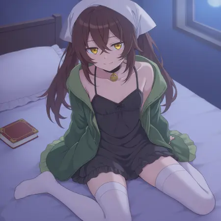 옷차림: 기호 모양의 목걸이, 녹색 오픈 재킷, 흰색 허벅지 긴 양말, 검은 프릴 카미소르