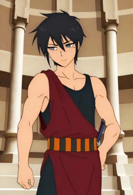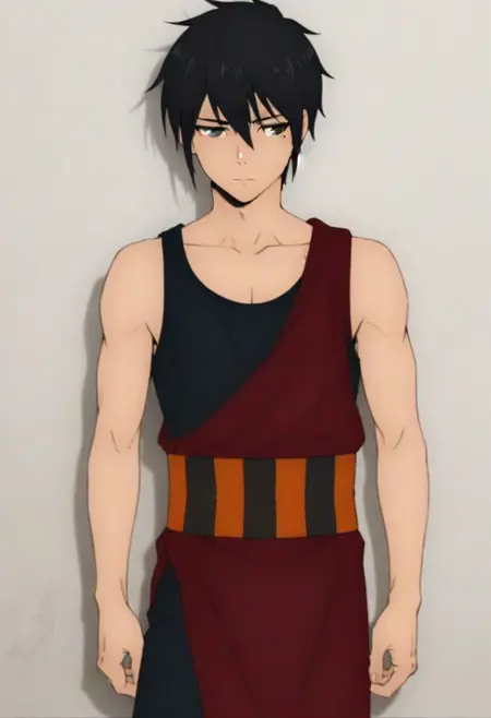Hatz, black hair, black-gray eyes, mole under one eye, black tank top, long red Japanese garb, striped obi, black cropped pants, black sandals, double katanas