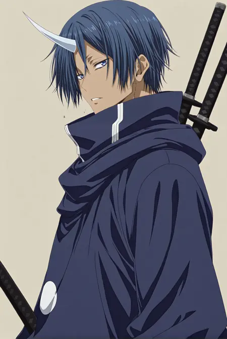 蓝色服装,白色围巾, katana,背后武器,刀鞘内置