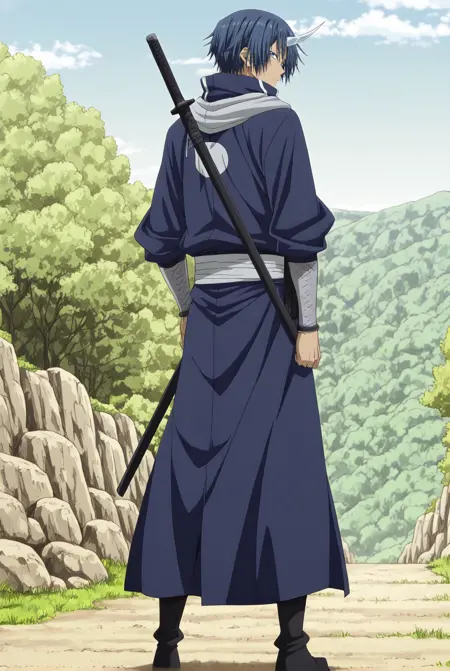 blue clothes, white scarf, katana , weapon on back, sheathed
