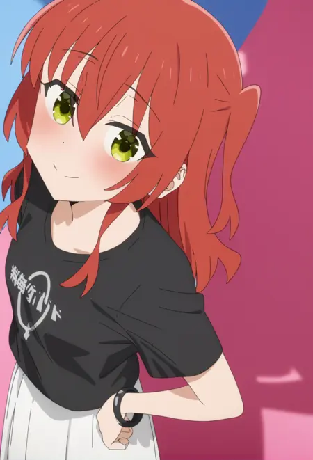 <lora:Kita IkuyoV1.1-Nuclear1811-IL:1>,Kita Ikuyo,green eyes,red hair,long hair,bangs,hair between eyes,one side up,half updo,ch3,ch3 jewelry,ch3 shirt,ch3 t-shirt,ch3 black shirt,ch3 short sleeves,ch3 bracelet,ch3 black bracelet,ch3 skirt,ch3 white skirt,ch3 long skirt,ch3 pleated skirt,ch3 socks,ch3 pink socks,ch3 shoes,ch3 sneakers,ch3 black footwear,
