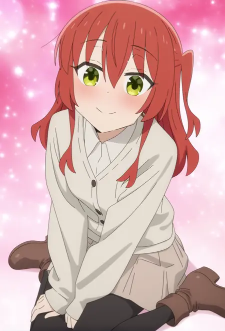 <lora:Kita IkuyoV1.1-Nuclear1811-IL:1>,Kita Ikuyo,green eyes,red hair,long hair,bangs,hair between eyes,one side up,half updo,ch6,ch6 sweater,ch6 buttons,ch6 long sleeves,ch6 dress,ch6 collared dress,ch6 light brown skirt,ch6 pleated dress,ch6 bows,ch6 pantyhose,ch6 black pantyhose,ch6 boots,ch6 brown footwear,ch6 ankle boots,