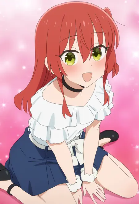 <lora:Kita IkuyoV1.1-Nuclear1811-IL:1>,Kita Ikuyo,green eyes,red hair,long hair,bangs,hair between eyes,one side up,half updo,ch9,ch9 choker,ch9 black choker,ch9 shirt,ch9 white shirt,ch9 blouse,ch9 frilled shirt,ch9 frills,ch9 short sleeves,ch9 frilled sleeves,ch9 scrunchie,ch9 white scrunchie,ch9 wrist scrunchie,ch9 belt,ch9 white belt,ch9 white bow,ch9 white bow,ch9 skirt,ch9 blue skirt,ch9 ankle strap,ch9 shoes,ch9 black footwear,ch9 high heels,