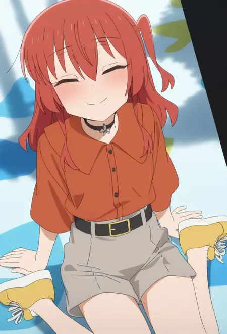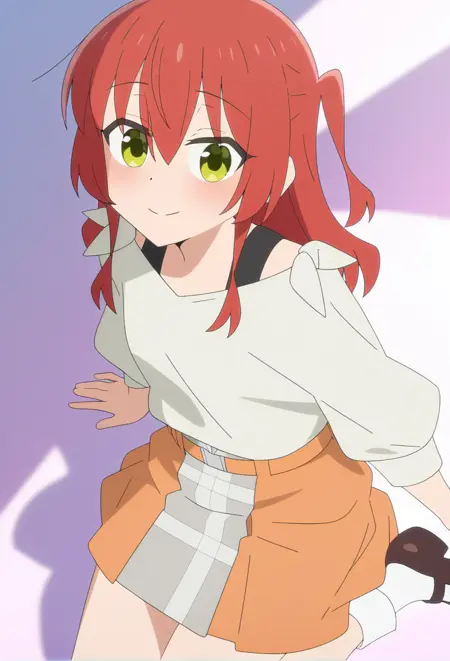<lora:Kita IkuyoV1.1-Nuclear1811-IL:1>,Kita Ikuyo,green eyes,red hair,long hair,bangs,hair between eyes,one side up,half updo,ch8,ch8 choker,ch8 black choker,ch8 shirt,ch8 orange shirt,ch8 collared shirt,ch8 belt,ch8 black belt,ch8 belt buckle,ch8 shirt tucked in,ch8 shorts,ch8 grey shorts,ch8 shoes,ch8 yellow footwear,ch8 sneakers,ch8 bow,ch8 bow on shoes,