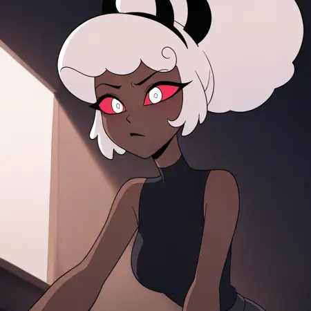 Velvette: Is added as experminet, will share a lot of tag for V's pack version to see how loras will interact, HHOVP-VelV.01, pink hair, red sclera, white eyes, slit pupils, twintails, dark-skinned female, dark skin, HHp4ck-Velv, striped, <-- She kinda works anywawy